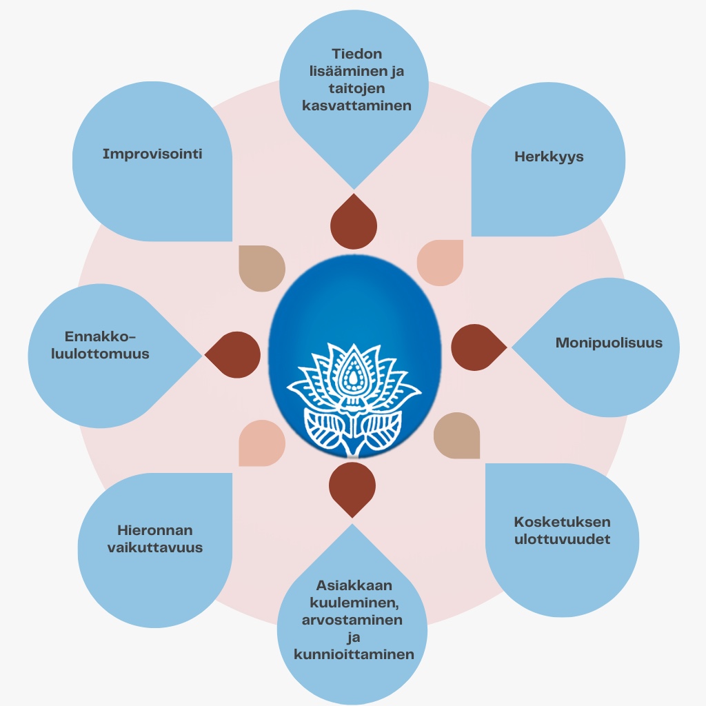 Osaamisen ytimessä on hierontaan ja hyvinvointiin liittyvän tiedon lisääminen ja hoitotaitojen kasvattaminen. Tällä alalla ei koskaan kannata kuvitella olevansa täysinoppinut. Monipuolisuudella tarkoitan sekä palveluiden valikoimaa, että toisaalta hoitotilanteessa keinoja ratkaista asiakkaan kehon vaivoja. Monipuolisuutta painotan erityisesti Fuusiohieronnan, oman hierontatyylini kehittämisessä. Improvisoinnilla taas tarkoitan sitä, että erityisesti hoitotilan ulkopuolella pystyn soveltamaan olemassa olevaa osaamista välineistä riippumatta.